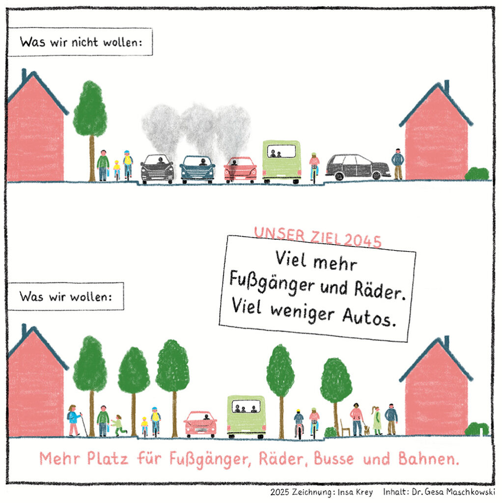 In der Zukunft gibt es überall breite Fuß·wege und Rad·wege.