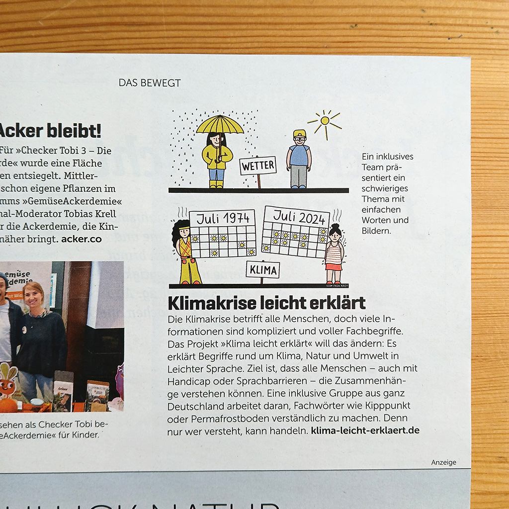 25.03.2025 (ik) Das Biomagazin „eve“ hatte bei uns angefragt, ob sie über unser Klima Leicht Erklärt – Projekt berichten können. Nun ist die neue Ausgabe des Magazins erschienen.Auf Seite 7 findet man oben eine Zeichnung von uns und dazu einen Text. Die Zeichnung ist von Insa. Sie zeigt den Unterschied zwischen Wetter und Klima. In dem Text […]