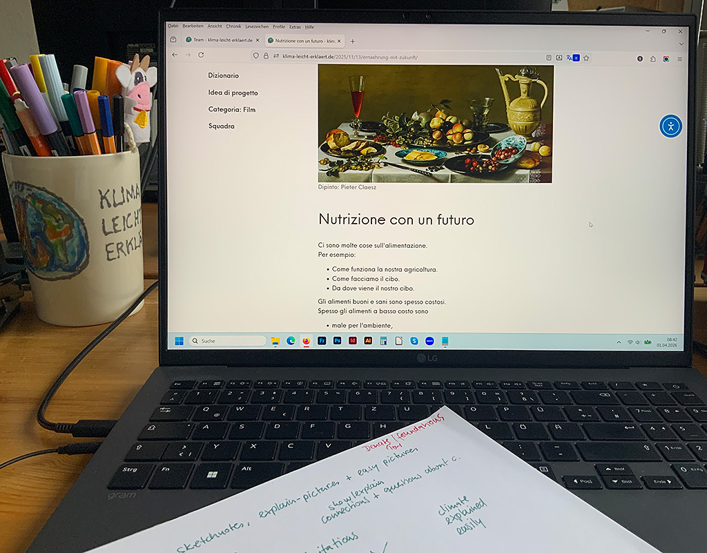 31.03.2026 (ik) Anfang des Jahres bekamen wir eine Anfrage: Kann jemand von uns das Projekt Klima Leicht Erklärt bei einem Onlinetreffen mit italienischen Übersetzer*innen für Leicht Sprache Vorstellen?Ich habe zugesagt und war gestern bei diesem Treffen dabei. Ich war etwas aufgeregt, weil ich auf englisch sprechen musste…Damit die italienischen Kollegen unsere Webseite lesen können, habe […]